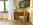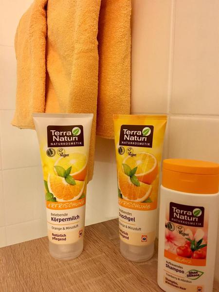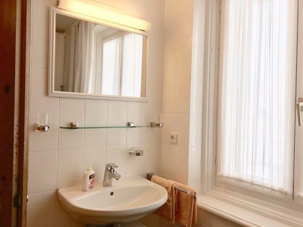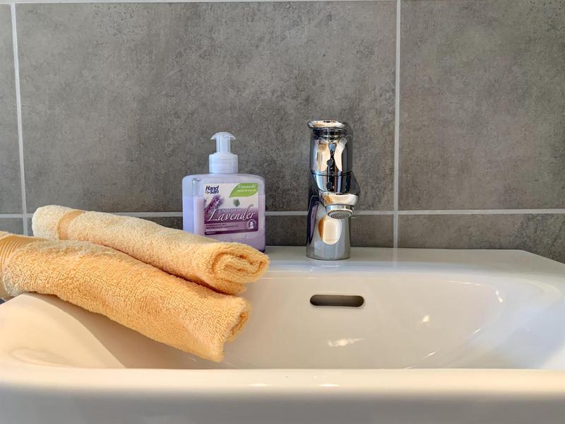 Das Badezimmer mit Tageslicht ist ausgestattet mit Bademantel, Harfön, Kosmetikartikel.